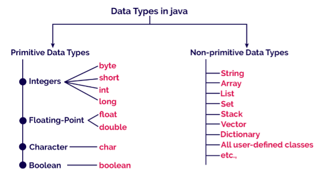 Los primitivos son los más básicos y fundamentales, vienen integrados en Java. Especifican el tipo de valor almacenado en una variable y el tamaño de la memoria. Hay 8 tipos primitivos de datos integrados en el lenguaje Java. Estos incluyen: int, byte, short, long, float, double, boolean y char.