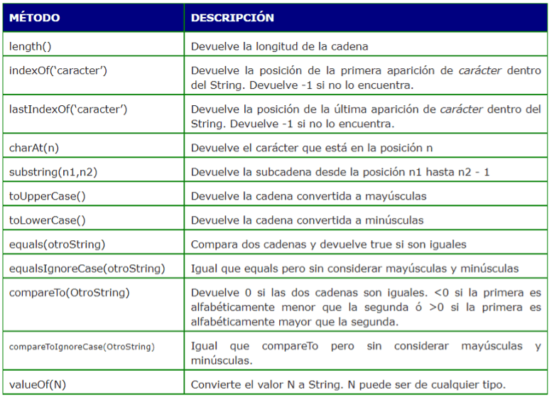 La clase String proporciona métodos para el tratamiento de las cadenas de caracteres: acceso a caracteres individuales, buscar y extraer una subcadena, copiar cadenas, convertir cadenas a mayúsculas o minúsculas, etc.