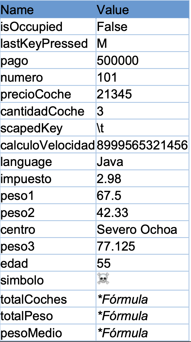 - AC 201 (RA1 / CE1b CE1c CE1d / IC1 / 3p) Ayúdate de los rangos de los valores para saber qué tipo de datos es, del nombre que se le ha dado y del valor que almacena cada variable. Las variables con valor Fórmula, son variables que calculan expresiones ayudándose de otras variables. Su tipo de datos es el predefinido por Java.