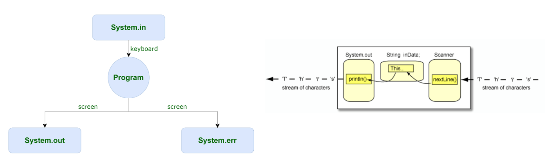 En Java, cualquier origen o destino de I/O se considera un flujo de bytes o caracteres. Para realizar la salida, insertamos bytes o caracteres en la secuencia. Para realizar la entrada, extraemos bytes o caracteres del flujo (stream