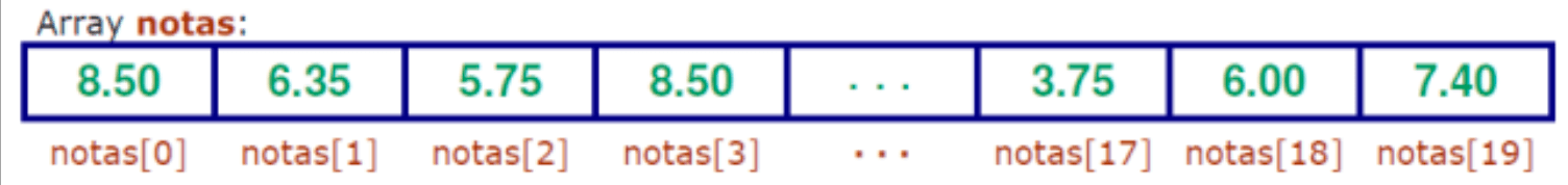 En el ejemplo anterior, notas[0] contiene la nota del primer alumno y notas[19] contiene la del último.