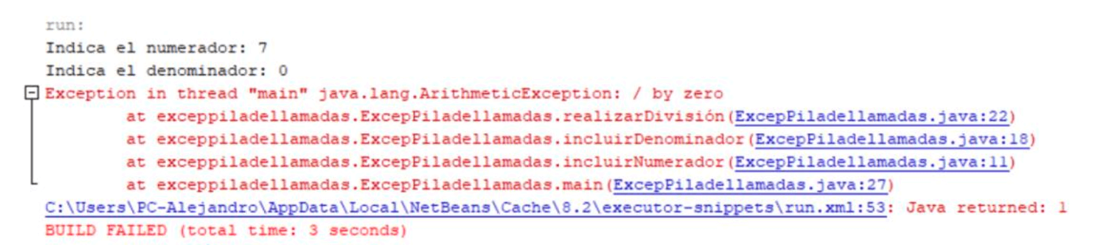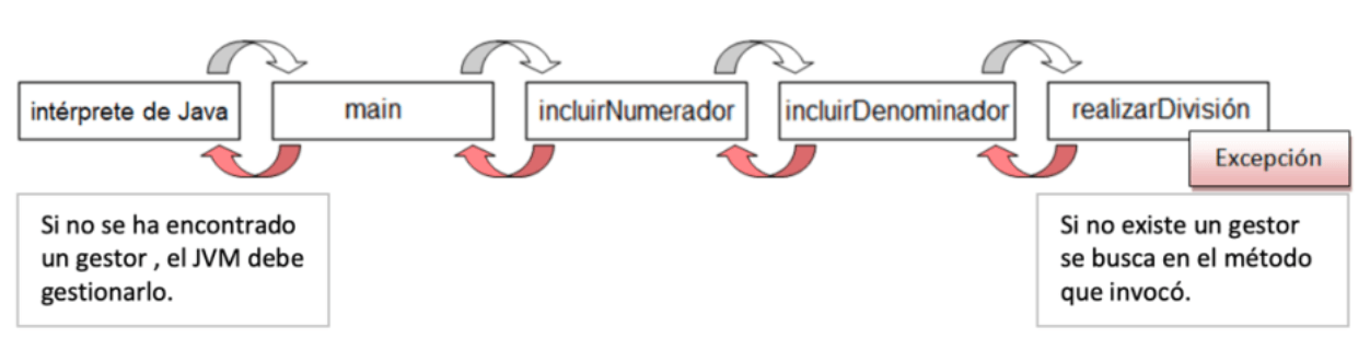 • Si el método no contiene un manejador para la excepción se busca en el método que llamó a este y así sucesivamente en toda la pila de llamadas.