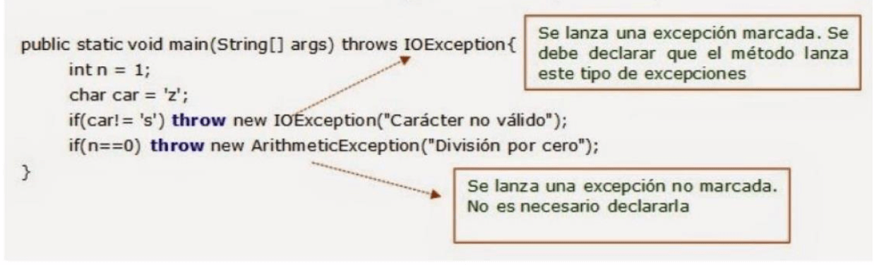 throw para lanzar un tipo de excepción comprobada o marcada, debe indicarse en su declaración con la cláusula throws.