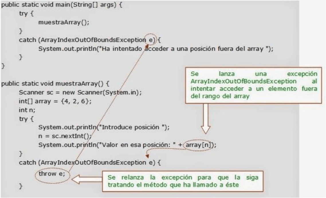 Si se ha capturado una excepción es posible relanzar desde el bloque catch la excepción (el mismo objeto recibido en el bloque catch) utilizando la instrucción throw objetoExcepcion.
